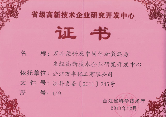 ◆ 2011: "Polyester Ultrafine Fiber High Wash Fastness KXF Series Disperse Dyes" won the Third Prize of Science and Technology of Zhejiang Province
